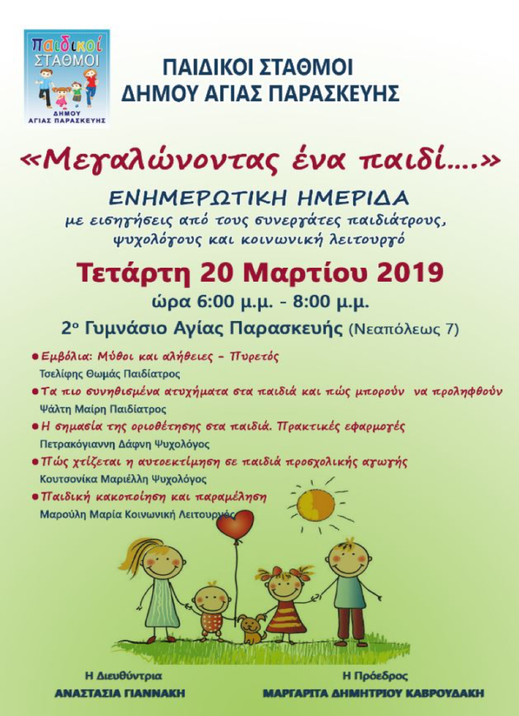 Οι Παιδικοί Σταθμοί του Δήμου Αγίας Παρασκευής-ΠΑΙΣΔΑΠ διοργανώνουν και προσκαλούν γονείς, κηδεμόνες και παιδαγωγούς σε ενημερωτική ημερίδα με τίτλο: «Μεγαλώνοντας ένα παιδί…», την Τετάρτη 20 Μαρτίου, 6:00 μ.μ. – 8:00 μ.μ στο θέατρο του 2ου Γυμνασίου (Νεαπόλεως 7).