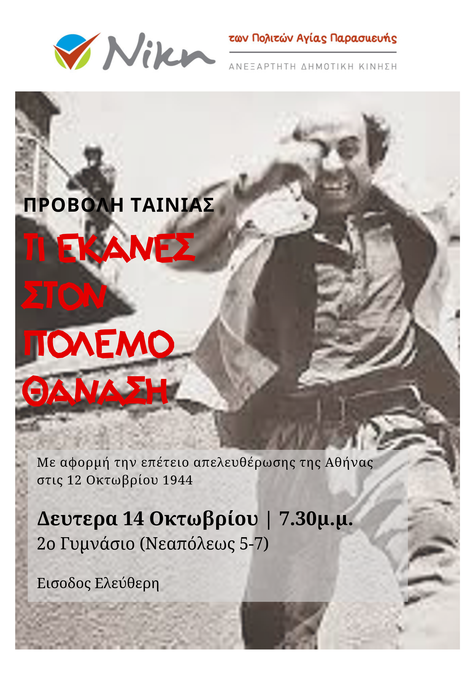 Με αφορμή την επέτειο απελευθέρωσης της Αθήνας στις 12 Οκτωβρίου 1944 η Ανεξάρτητη Δημοτική Κίνηση “ΝΙΚΗ των ΠολιτώνΑγ. Παρασκευής” σας καλεί στην προβολή της ταινίας του Ντίνου